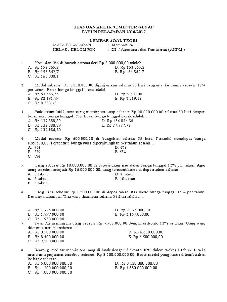 Soal Uas Genap 1617 Kelas Xi Akpm from imgv2-1-f.scribdassets.com Tentukan bunga yang ditanggung oleh pak adi jika akan meminjam selama: Bunga tunggal adalah bunga yang setiap jangka waktu tertentunya selalu tetap. Tentukan keseluruhan nominal yang harus dikembalikan oleh pak budi jika akan meminjam sclama a. Tentukan keseluruhan nominal yang harus dikembalikan oleh pak andi jika akan meminjam selama 18 tahun dan tentukan berapa cicilan yang harus di bayar tiap bulannya Pak budi meminjam uang di bank sebesar rp1.000.000,00 dengan bunga 18% pertahun.keseluruhan nominal yang harus dikembalikan oleh pak budi jika akan meminjam selama 6 bulan adalah rp1.090.000,00. Dia mengangsur pinjaman tersebut dengan nominal rp200.000,00 perbulan, selama 1 tahun. Jumlah yang harus dibayar baba pada bank a. Pak bagus meminjam uang di bank sebesar rp2.000.000,00 rupiah.