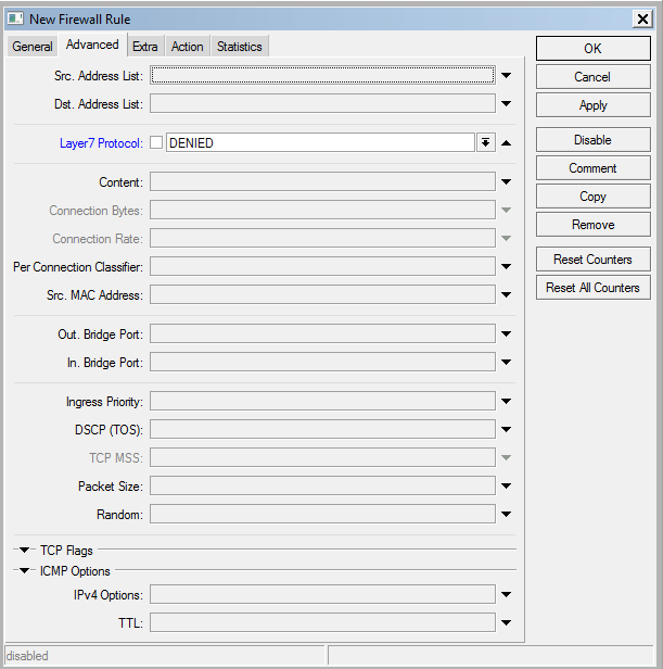 Pada menu ip > firewall kemudian di tab filter rules klik tanda (+) untuk membuat filter baru . Kumpulan script regex layer 7 protocol mikrotik untuk limit video streaming dan limit download file. Mikrotik firewall is capable to block any website with not only source address or destination address but also layer7 protocol. Here we will discuss how to block website on mikrotik? Mikrotik layer 7 protocol adalah metode mencari pola dalam aliran icmp/tcp/udp.